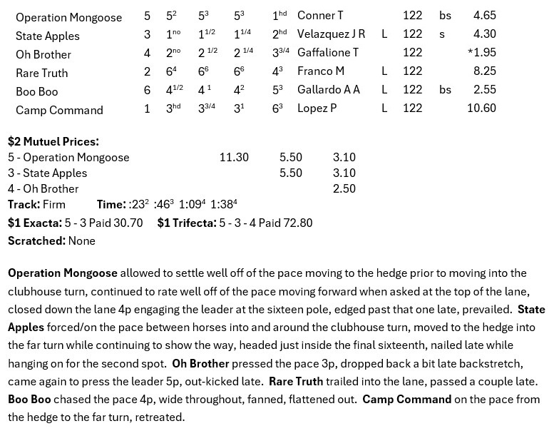 Maxmillion Farm stays hot in Louisville as Operation Mongoose comes from the back of the pack to win a photo and the Arlington Stakes (GIII). That’s two-for-two for the 6yo bay gelding since changing over to the long-time conditioner. He’s won eleven lifetime starts and has $353.050 in earnings. The final running time was 1:38.81 for the mile and a sixteenth, and the CD turf was listed as Firm. Congrats to the Connections!